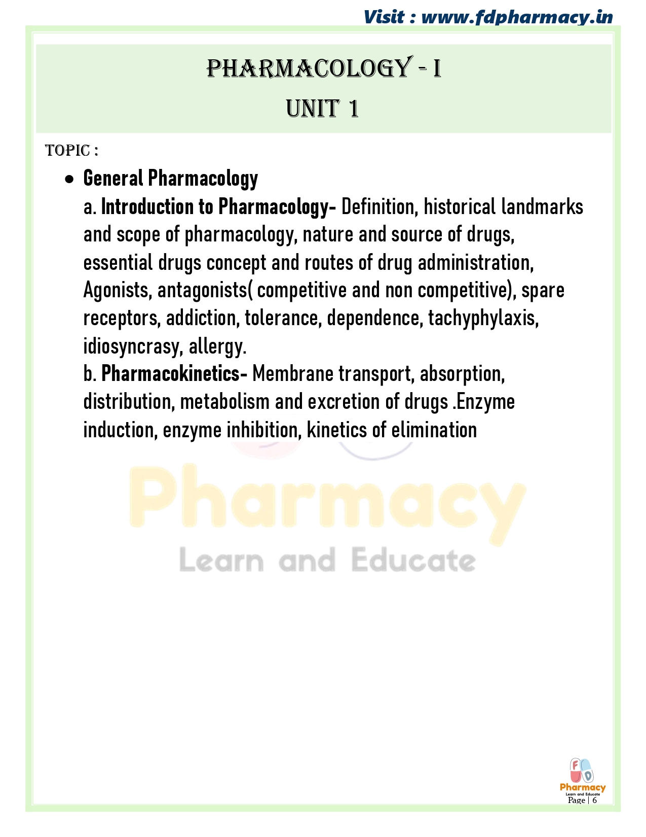 a. Introduction to Pharmacology- Definition, historical landmarks and scope of pharmacology, nature and source of drugs, essential drugs concept and routes of drug administration, Agonists, antagonists( competitive and non competitive), spare receptors, addiction, tolerance, dependence, tachyphylaxis, idiosyncrasy, allergy.