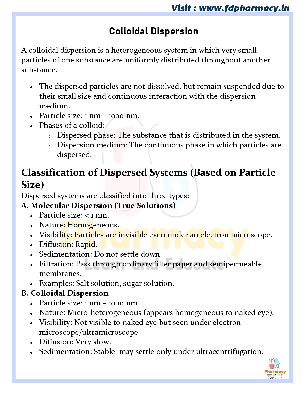 Colloidal dispersions : Classification of dispersed systems & their general characteristics, size & shapes of colloidal particles, classification of colloids & comparative account of their general properties. Optical, kinetic & electrical properties.
