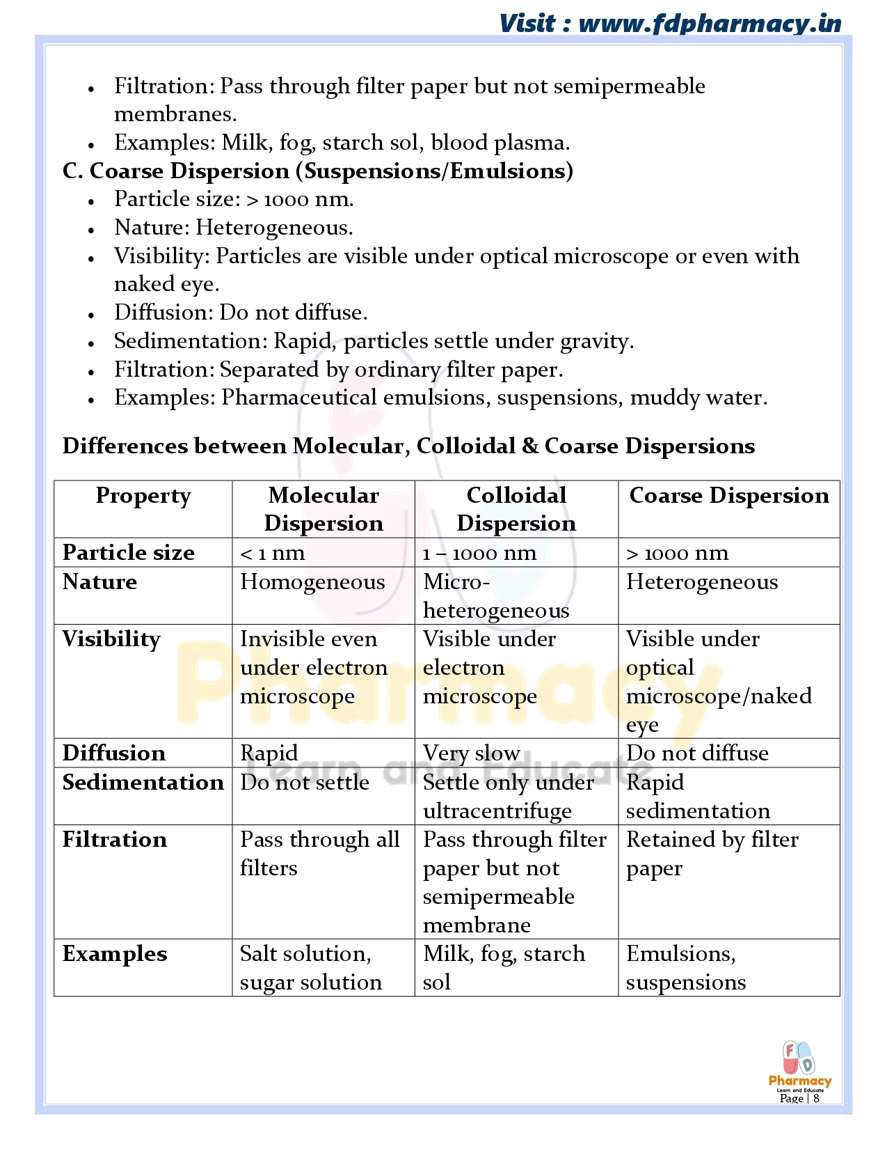 Coarse dispersion : Suspension, interfacial properties of suspended particles, settling in suspensions, formulation of flocculated and deflocculated suspensions. Emulsions and theories of emulsification, microemulsion and multiple emulsions; Stability of emulsions,